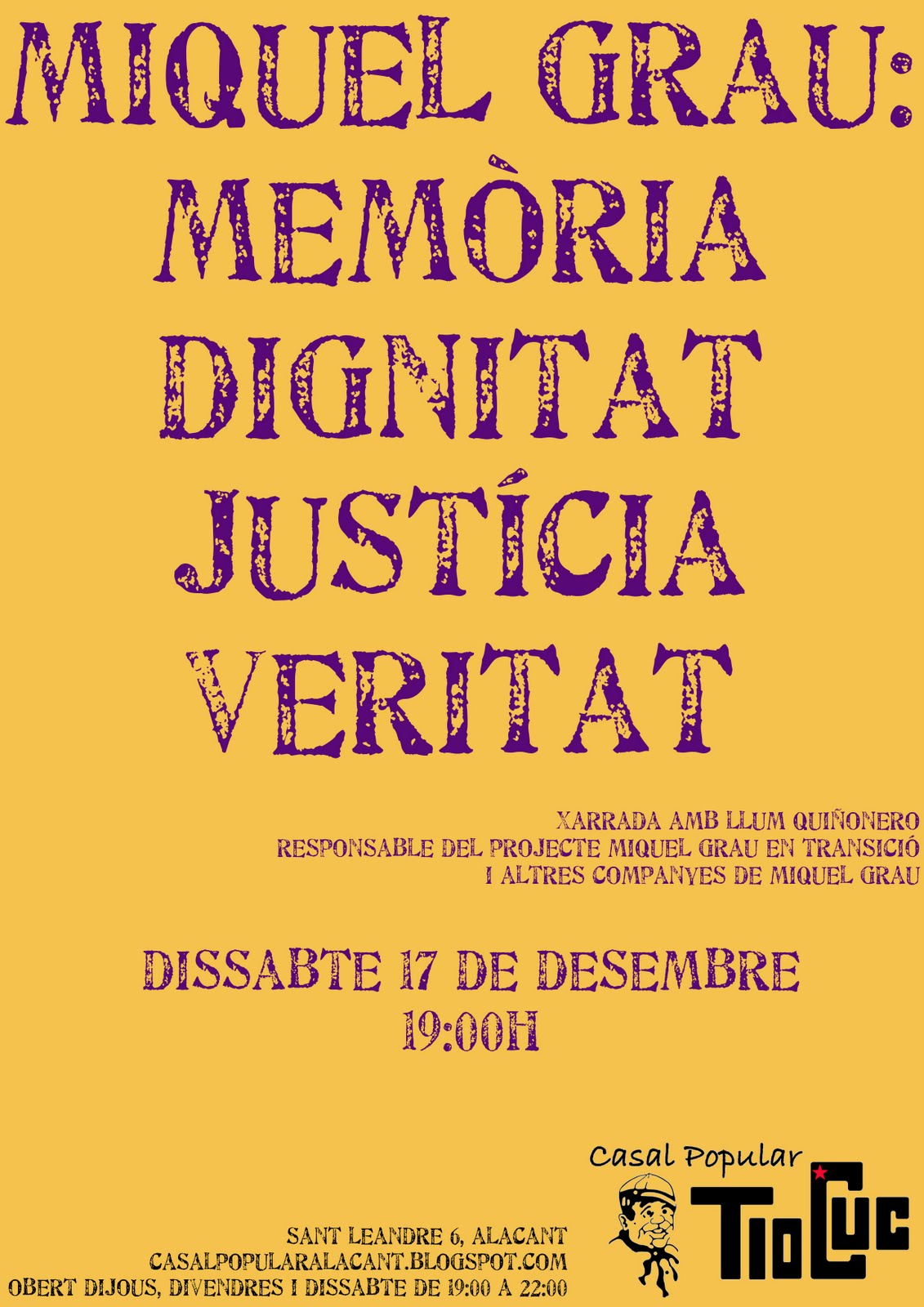 Dissabte 17 a les 19:00: Xarrada "Miquel Grau, memòria, dignitat, justícia, veritat". A càrrec de Llum Quiñonero.