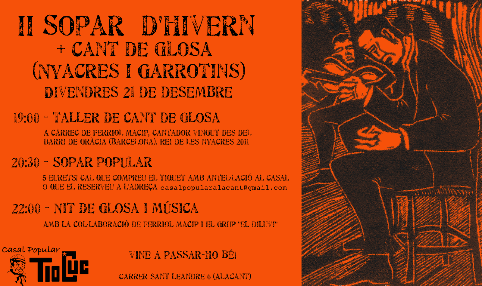 I ja cap a les 22:30, i amb les guitarres, bandúrries, violí, acordió i percusió, es va encetar la nit de cant de glosa, que va contar amb el cant de diversos cantadors vinguts des de terres barcelonines, iberudes, alcoianes, novelderes i, com no, alacantines. Cants a la picardia, la Terra i l'orgia popular van ser cantats, riguts i aplaudits per la vuitantena de persones que hi havia al públic, que a poc a poc s'anava deixant anar per la boiror i l'alegria de l'ambient.