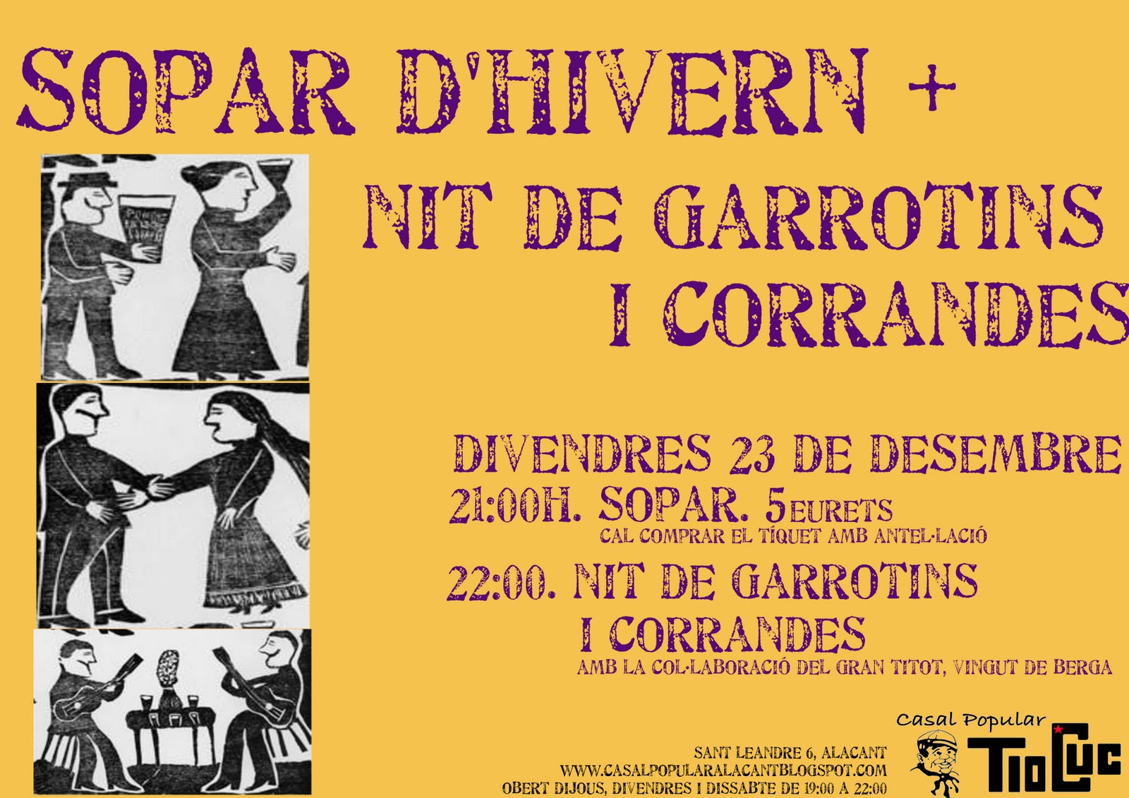El sopar costa només 5 eurets i serà un bon moment per conèixer-nos, gaudir de bona companyia i passar un moment entranyable i en família. Tindrem corrandes i garrotins, i contarem amb la col·laboració del gran Titot vingut des de Berga.
